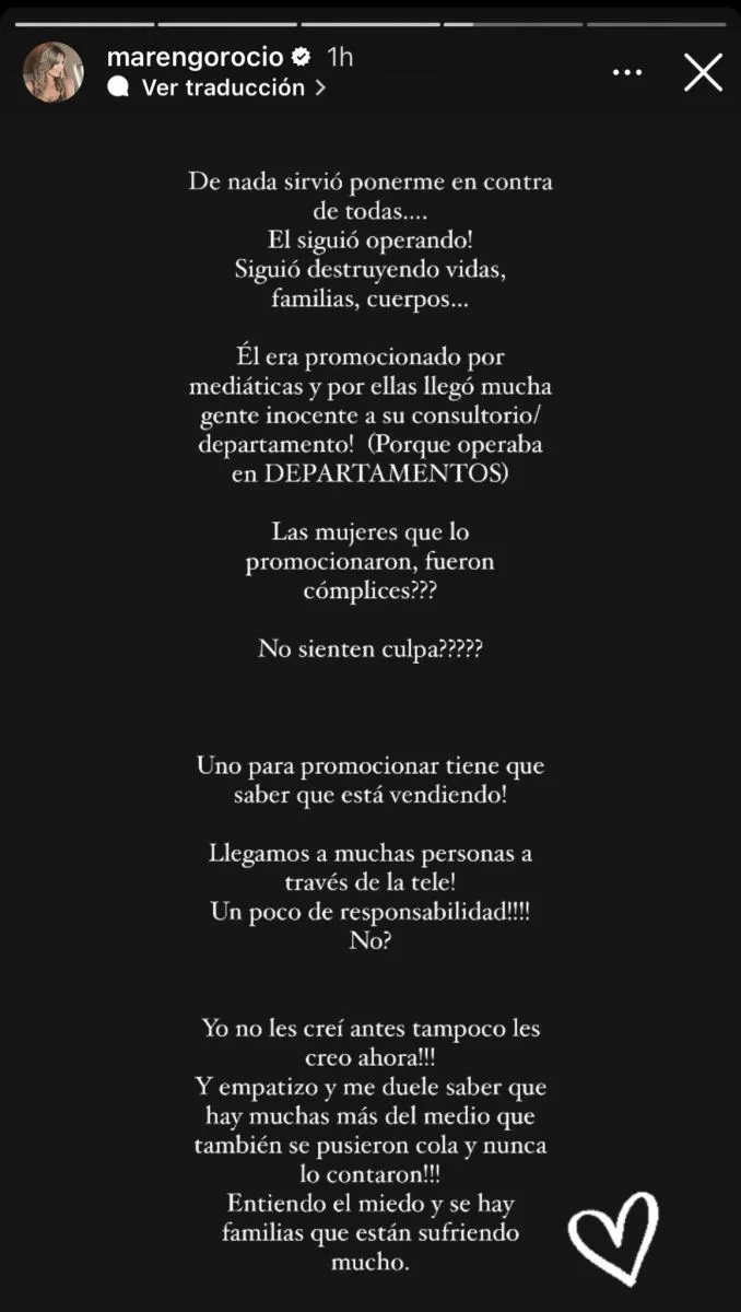 En sus redes sociales, la modelo expresó su indignación: «De nada sirvió ponerme en contra de todas… Él siguió operando! Siguió destruyendo vidas, familias, cuerpos… ¡Él era promocionado por mediáticas y por ellas llegó a mucha gente inocente a su consultorio / departamento! (Porque operaba en departamentos). ¿Las mujeres que lo promocionaron, fueron cómplices? ¿No sienten culpa?».