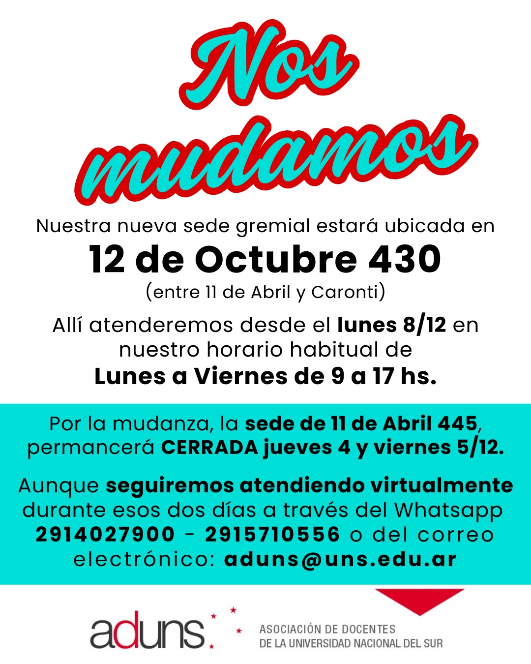 La Asociación de Docentes de la Universidad Nacional del Sur (ADUNS) ha comunicado a sus afiliados y a la comunidad en general un significativo cambio logístico que marca una nueva etapa en su gestión gremial. La entidad dejará su actual sede en 11 de Abril 445 para establecerse en 12 de Octubre 430.
