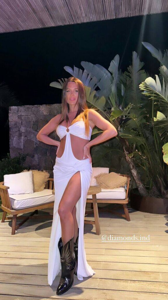 Luego, recostada sobre una reposera, la exmujer de Rodrigo De Paulse lució con una microbikiniblancacon detalles que marcaron la diferencia. El corpiño es simple, con moldería de triangulito, tiene tiras batik con detalles en negro que se entecruzan en el delantero y una enorme arandela metálica plateada en el centro de la pieza. La bombacha, en tanto, es tiro alta, colaless y cuenta con las mismas arandelas en los laterales.