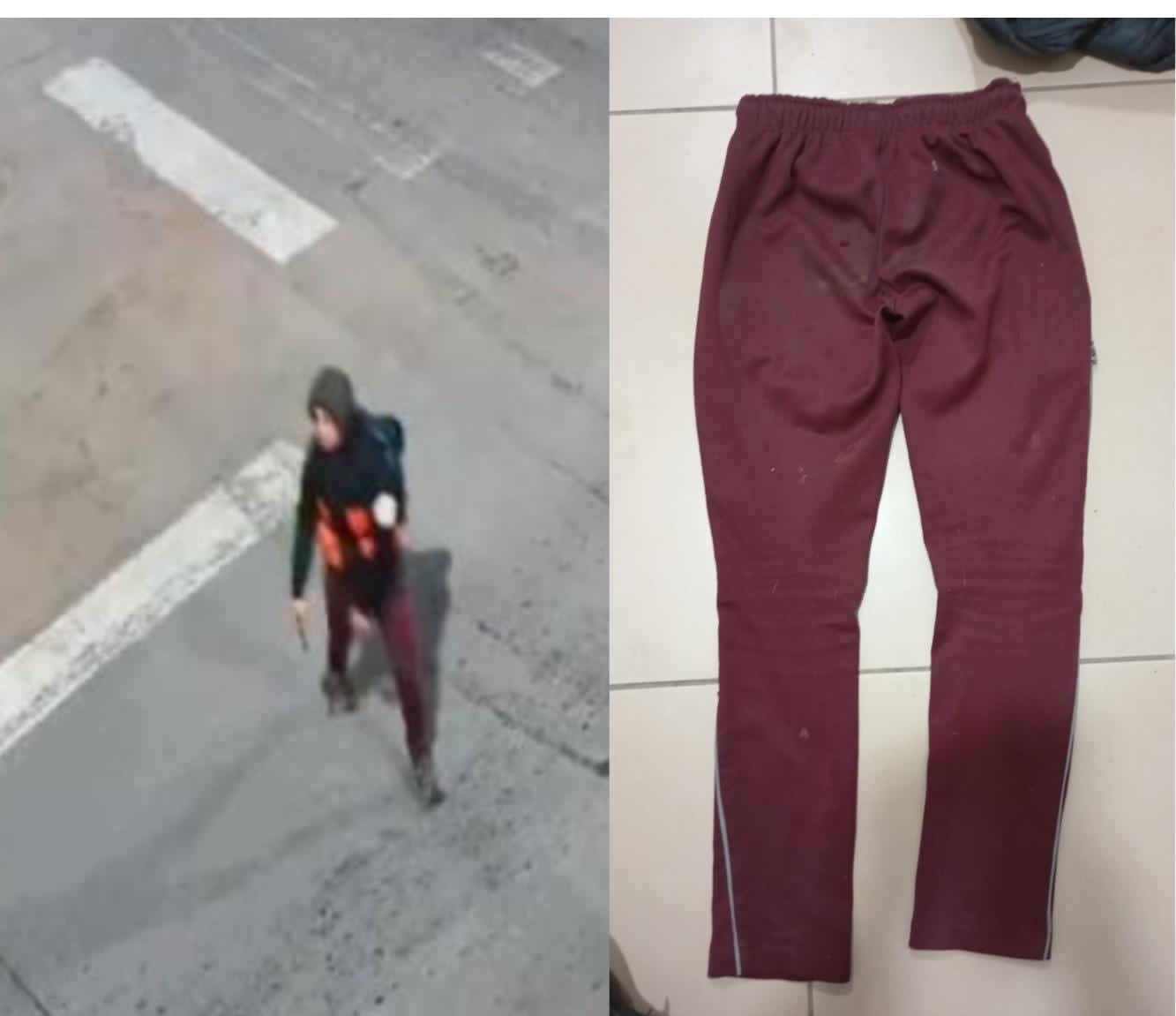 - Prendas de vestir: 1 pantalón jogging bordo y una campera de abrigo gris, ropa que el delincuente habría utilizado al momento de cometer los ilícitos, según lo captado por las cámaras.