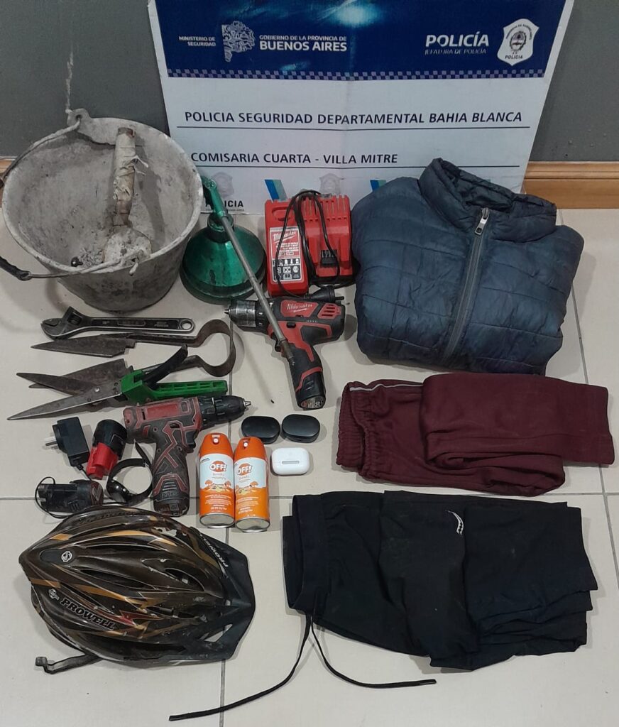 - Herramientas: Se recuperaron un destornillador y un taladro inalámbrico con sus respectivos cargadores y baterías, una llave francesa, un balde y una cuchara de albañil, y tijeras de tusar.