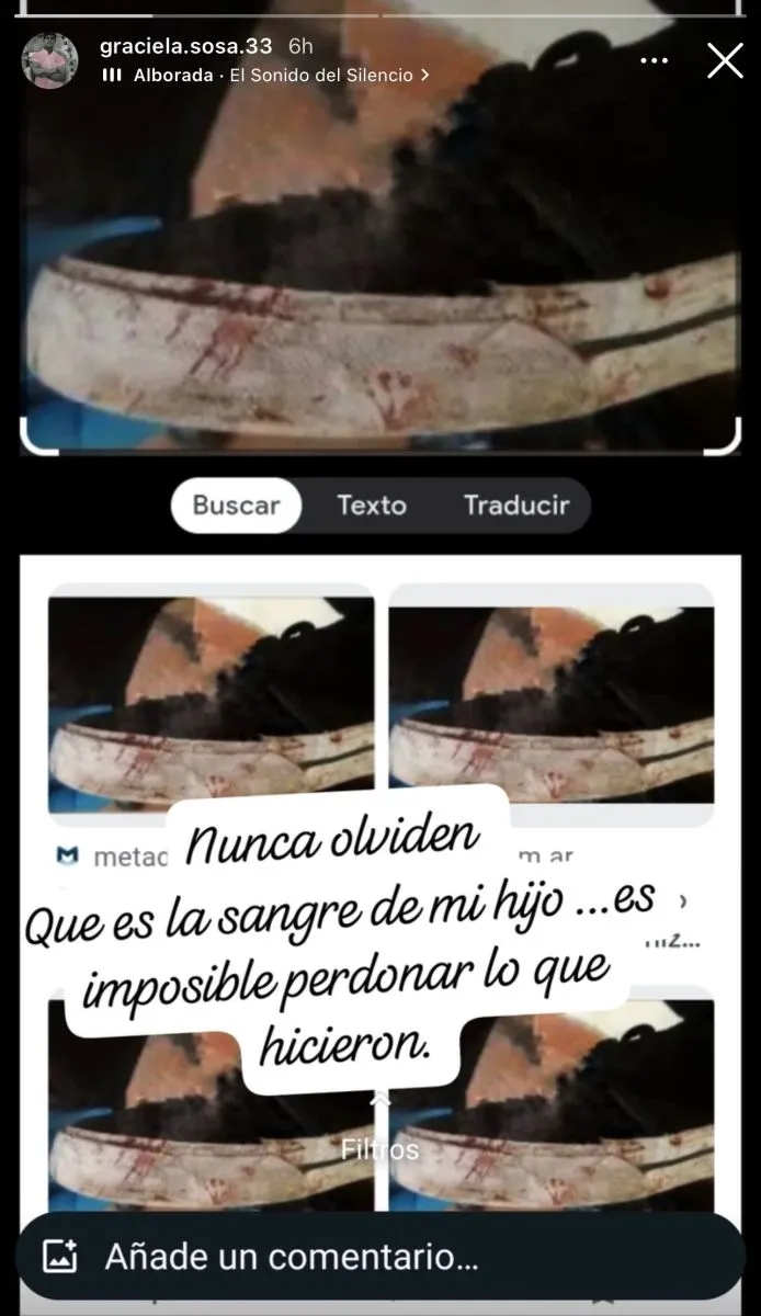 Luego de que el video saliera al aire de Telenoche, Graciela Sosa publicó dos posteos en su Instagram. «Nunca olviden que es la sangre de mi hijo… Es imposible perdonar lo que hicieron», rezaba el escrito, delante de una foto de las zapatillas ensangrentadas.