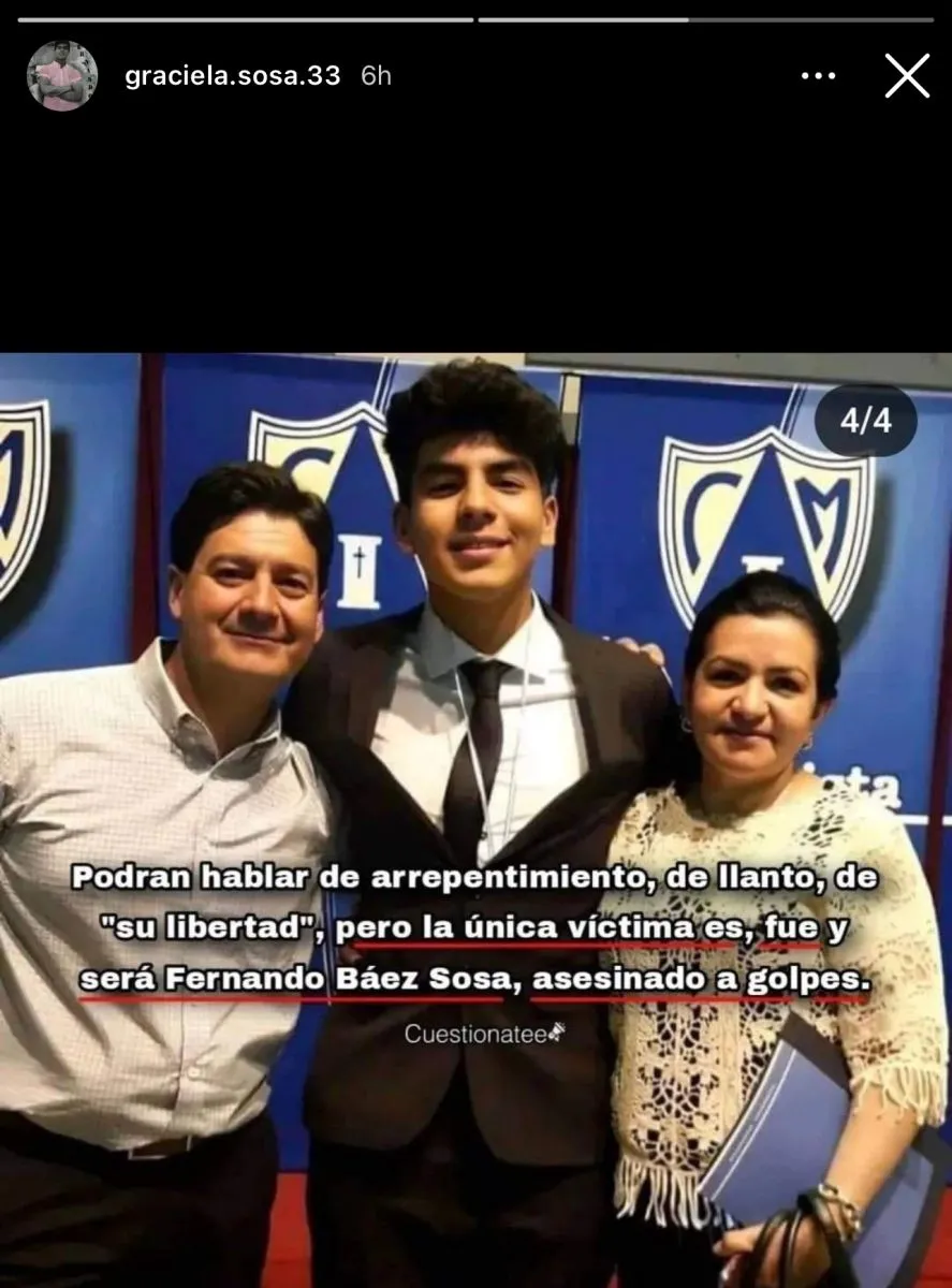 En un segundo posteo, compartió una foto donde Fernando está con ella y con Silvino, su padre. “Podrán hablar de arrepentimiento, de llanto, de ‘su libertad’, pero la única víctima es, fue y será Fernando Báez Sosa, asesinado a golpes”, decía el posteo.