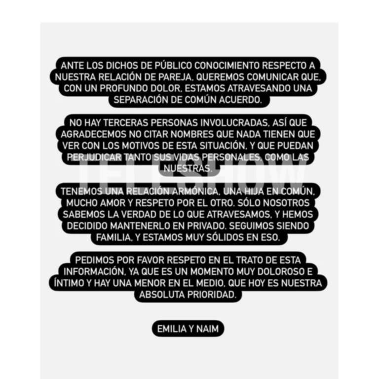 Para terminar, la actriz y el humorista hicieron un requerimiento muy especial: «Pedimos por favor respeto en el trato de esta información, ya que es un momento muy doloroso e íntimo, y hay una menor en el medio que hoy es nuestra absoluta prioridad. Emilia y Naim».