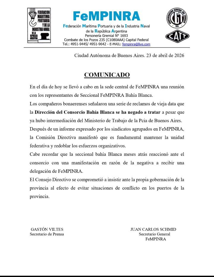 La conducción nacional de la Federación Marítima Portuaria y de la Industria Naval de la República Argentina (FeMPINRA) mantuvo este jueves un encuentro clave con representantes de la seccional Bahía Blanca en la Ciudad Autónoma de Buenos Aires. El objetivo central de la cita fue abordar la persistente negativa de la Dirección del Consorcio de Gestión del Puerto de Bahía Blanca (CGPBB) a tratar una serie de reclamos gremiales que datan de larga data.