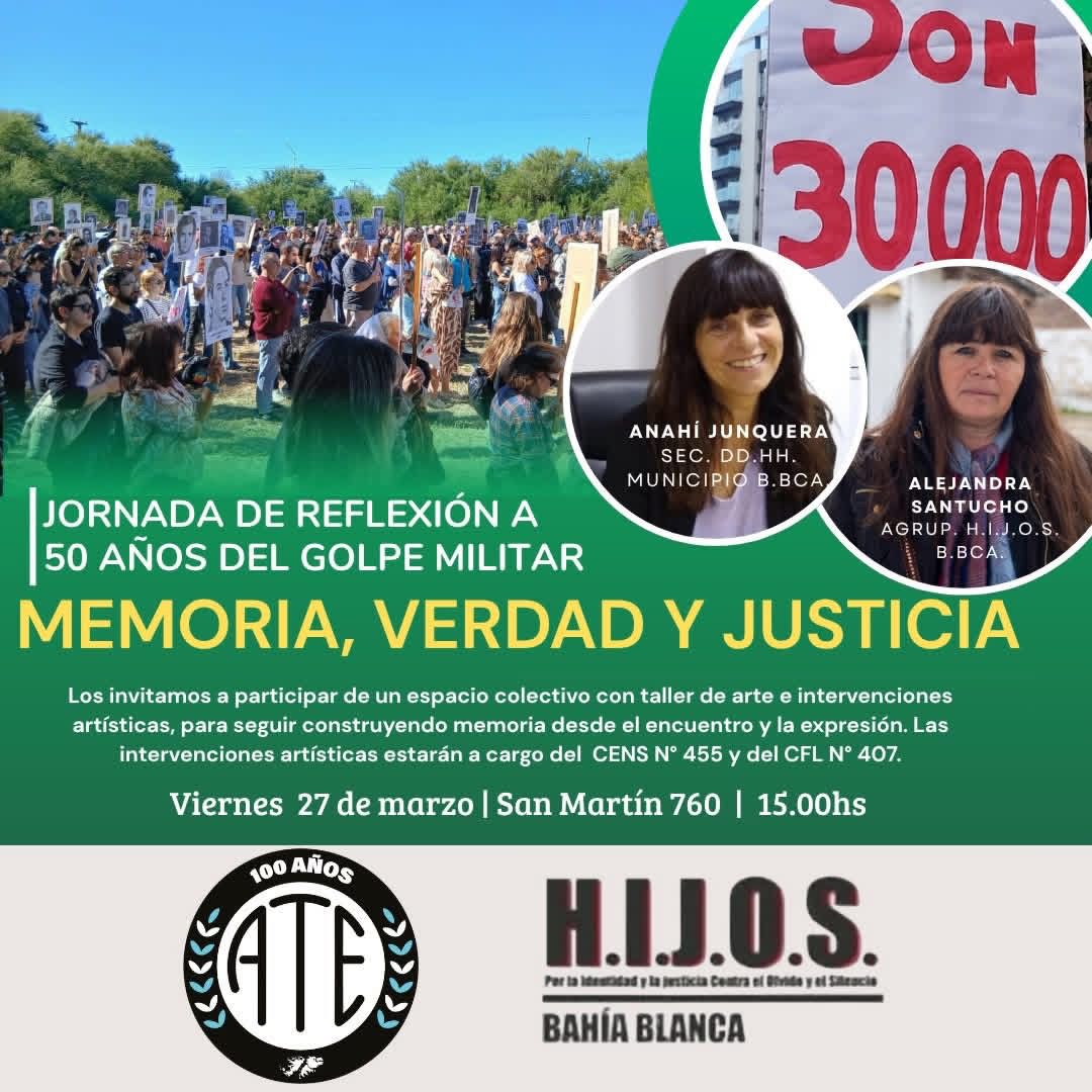 En el marco de un nuevo aniversario del quiebre institucional en Argentina, Bahía Blanca será sede de una «Jornada de reflexión a 50 años del golpe militar». La actividad, organizada bajo la consigna de Memoria, Verdad y Justicia, se desarrollará este viernes 27 de marzo a partir de las 15:00 hs en el local de San Martín 760.