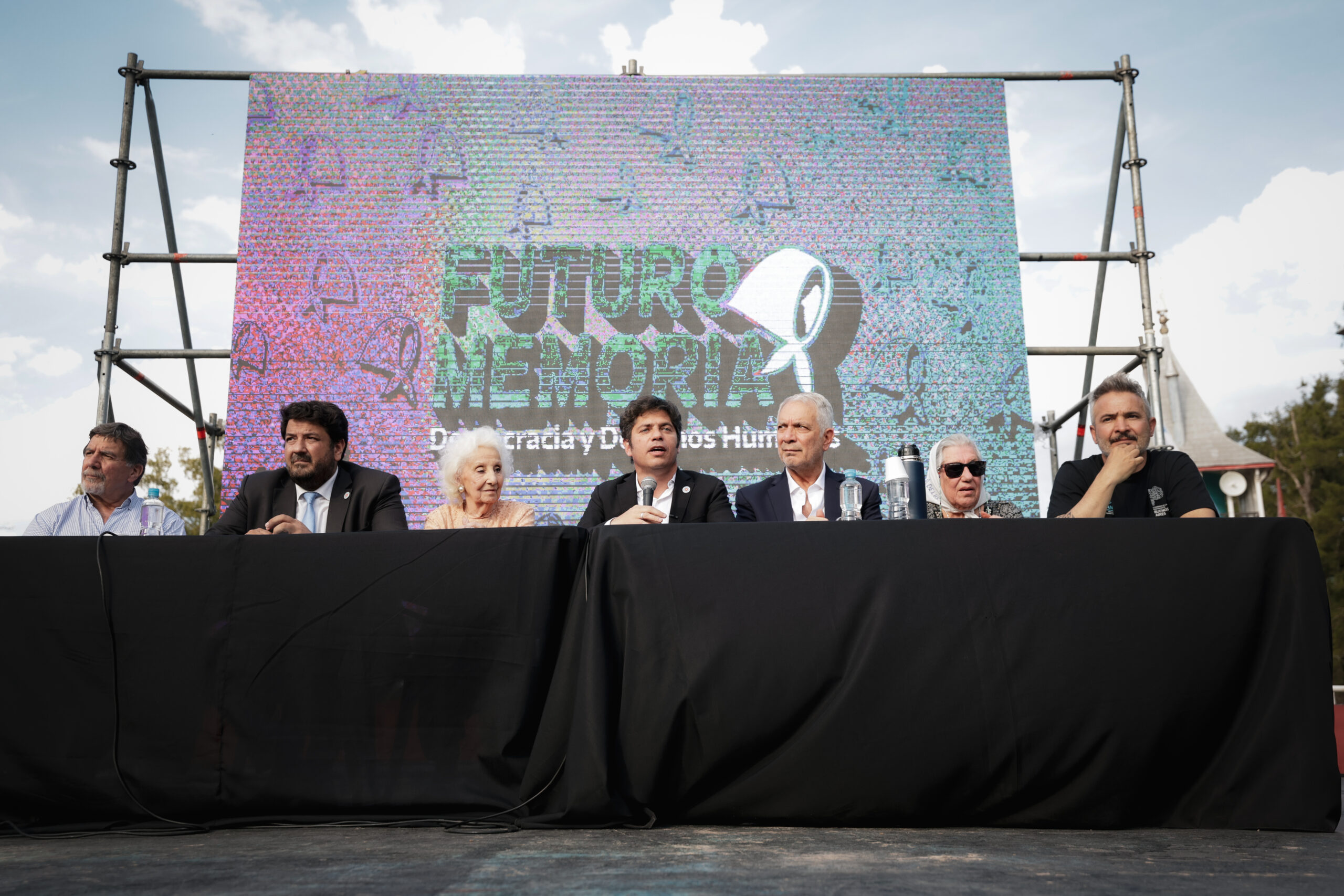 El gobernador Axel Kicillof encabezó este miércoles el cierre de la 5° edición del programa “Futuro Memoria”, una iniciativa que promueve la creación de producciones artísticas que visibilicen las luchas por la Memoria, la Verdad y la Justicia. Fue en la República de los Niños de la ciudad de La Plata junto al ministro de Justicia y Derechos Humanos, Juan Martín Mena; el director general de Cultura y Educación, Alberto Sileoni; el subsecretario de Derechos Humanos, Matías Moreno; el intendente local, Julio Alak; la presidenta de Abuelas de Plaza de Mayo, Estela de Carlotto; y Carmen Arias, en representación de la Asociación Madres de Plaza de Mayo.