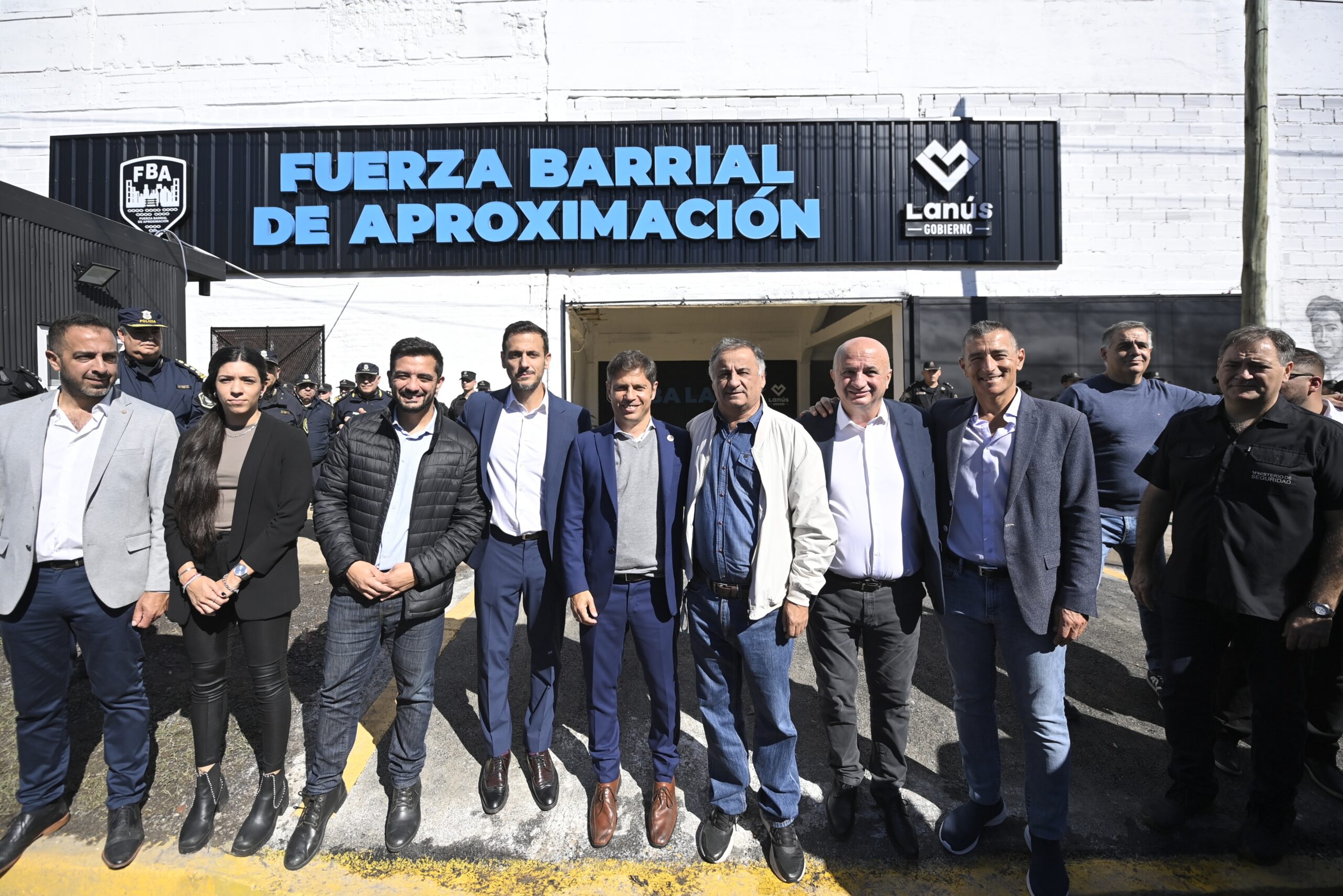 El gobernador de la provincia de Buenos Aires, Axel Kicillof, recorrió este martes las nuevas instalaciones de la Fuerza Barrial de Aproximación (FBA) en el municipio de Lanús, junto al ministro de Seguridad, Javier Alonso, y el intendente local, Julián Álvarez. Además, se efectuó la entrega de cuatro patrulleros y seis camionetas para fortalecer el Comando de Patrullas Municipal.