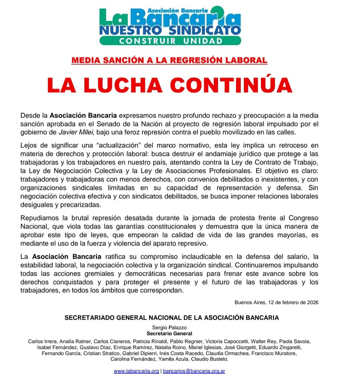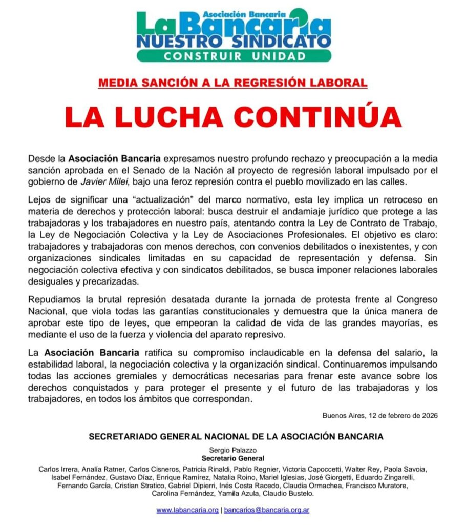 La Asociación Bancaria difundió un comunicado oficial en el que manifestó su rechazo a la media sanción otorgada en el Senado de la Nación al proyecto de reforma laboral promovido por el gobierno nacional. Bajo el título “La lucha continúa”, la organización sindical expresó su preocupación por lo que considera un retroceso en materia de derechos laborales y protección de los trabajadores.