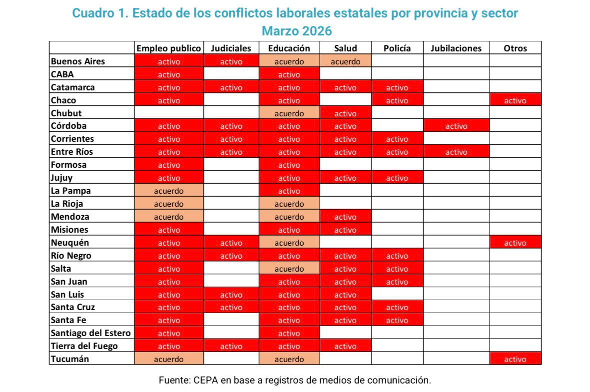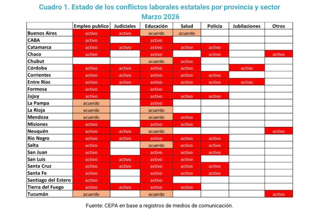 Un informe del Centro de Economía Política Argentina (CEPA) revela que la baja en los ingresos nacionales y provinciales impacta directamente en los salarios de docentes, médicos y policías. En lo que va de 2026, ya se registraron 92 conflictos estatales, de los cuales el 80% permanecen sin solución.