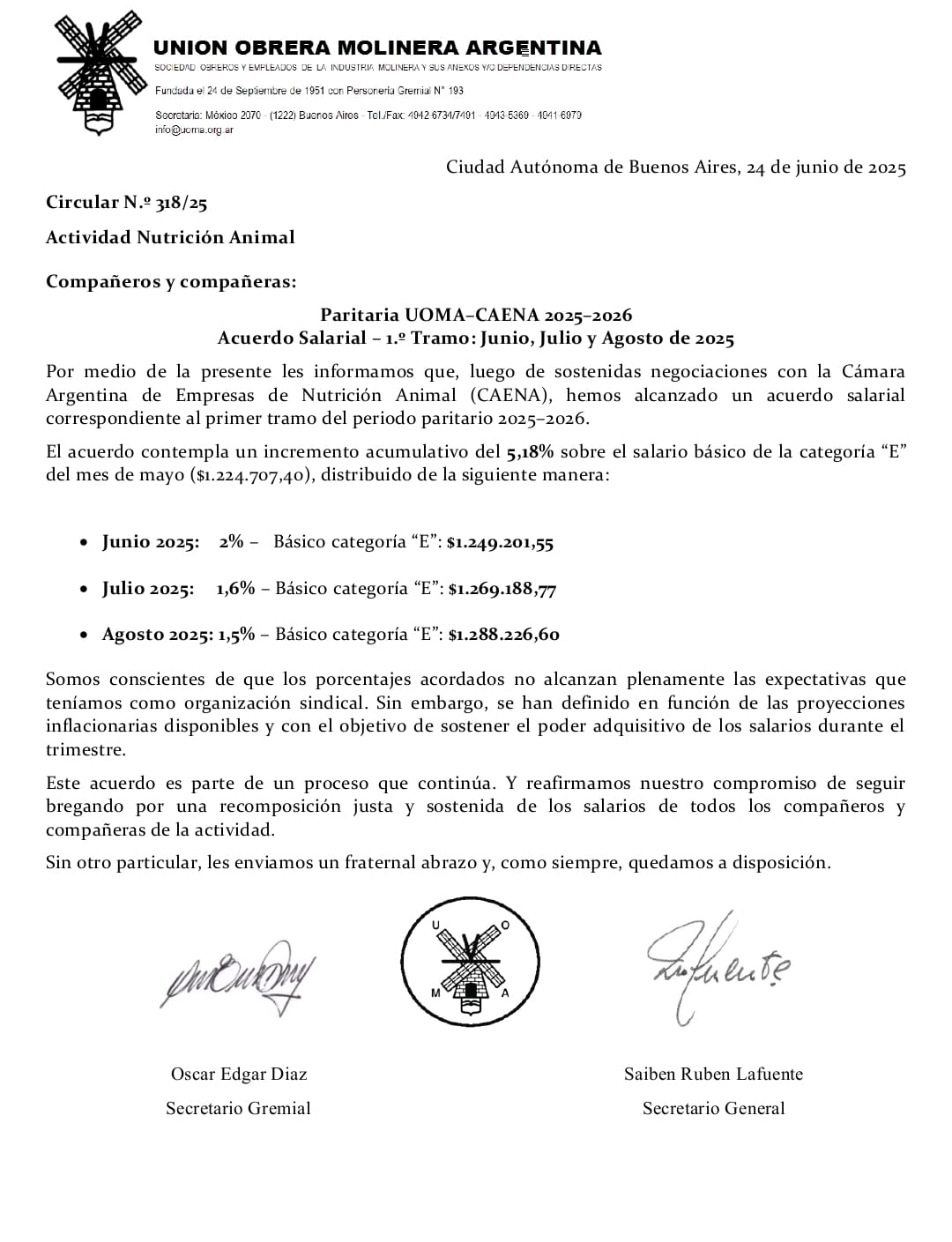 En un segundo frente de negociación, la UOMA también alcanzó un acuerdo salarial con la Cámara Argentina de Empresas de Nutrición Animal (CAENA). Este convenio corresponde al primer tramo del período paritario 2025-2026, abarcando los meses de junio, julio y agosto de 2025.