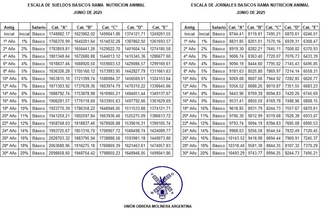 En un gesto de transparencia y para garantizar que todos los afiliados tengan acceso claro a la información, la UOMA adjuntó a sus comunicados las nuevas escalas de sueldos y jornales básicos para ambas ramas, Nutrición Animal y Molinera, ambas con vigencia a partir de junio de 2025. Estas tablas detallan de forma precisa los montos correspondientes a cada categoría y nivel de antigüedad, incorporando el concepto de presentismo del 8,33%.