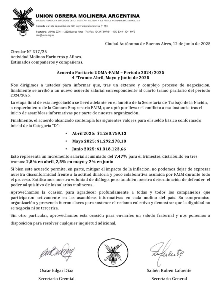 La Unión Obrera Molinera Argentina Sella Dos Importantes Acuerdos Salariales y Reafirma su Compromiso con el Poder Adquisitivo de los Trabajadores