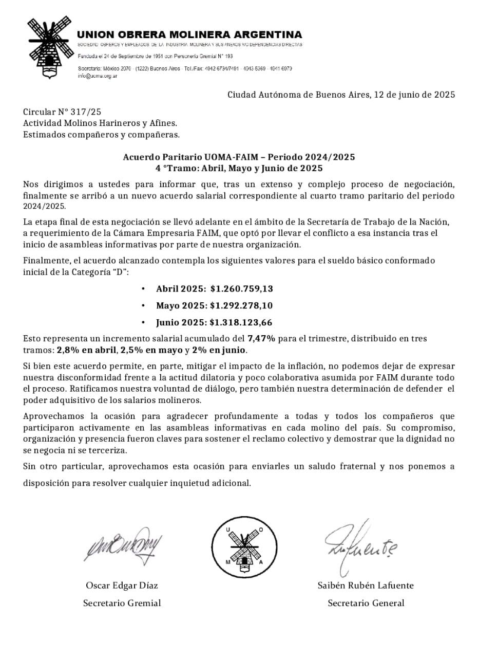 Ambos comunicados concluyen con un «fraternal abrazo» a todos los compañeros y compañeras, y la reiteración de la plena disposición de la UOMA para «resolver cualquier inquietud adicional», fortaleciendo así el vínculo y la confianza con sus miembros en este nuevo escenario salarial. Estos acuerdos representan un paso significativo en la defensa del poder adquisitivo de los salarios de los trabajadores del sector molinero y de nutrición animal en Argentina.