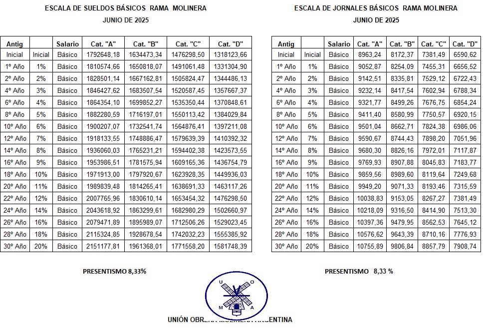 De manera similar, en la Rama Molinera, el salario básico inicial de Categoría «A» alcanzará los $1.792.648,18 en junio de 2025, con un jornal diario inicial de $8.963,24. Estas tablas también especifican los valores para las categorías «B», «C», y «D», y los porcentajes de antigüedad que ascienden hasta el 20%.