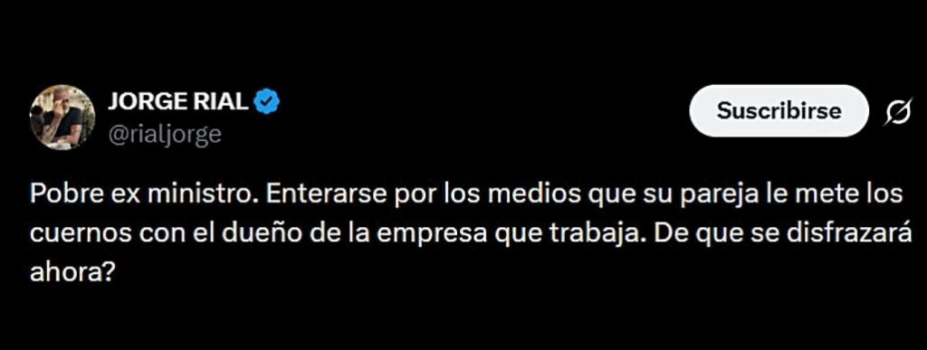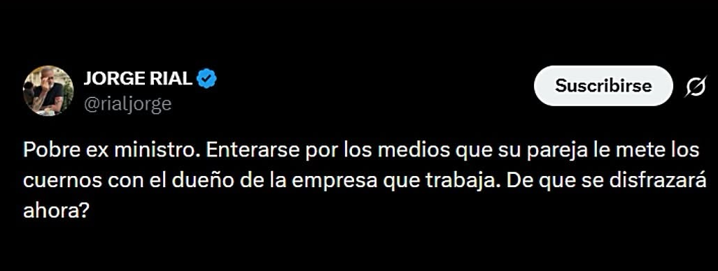El tuit de Rial fue breve pero demoledor: «Pobre ex ministro. Enterarse por los medios que su pareja le mete los cuernos con el dueño de la empresa que trabaja. ¿De qué se disfrazará ahora?», escribió el ex conductor de Intrusos.