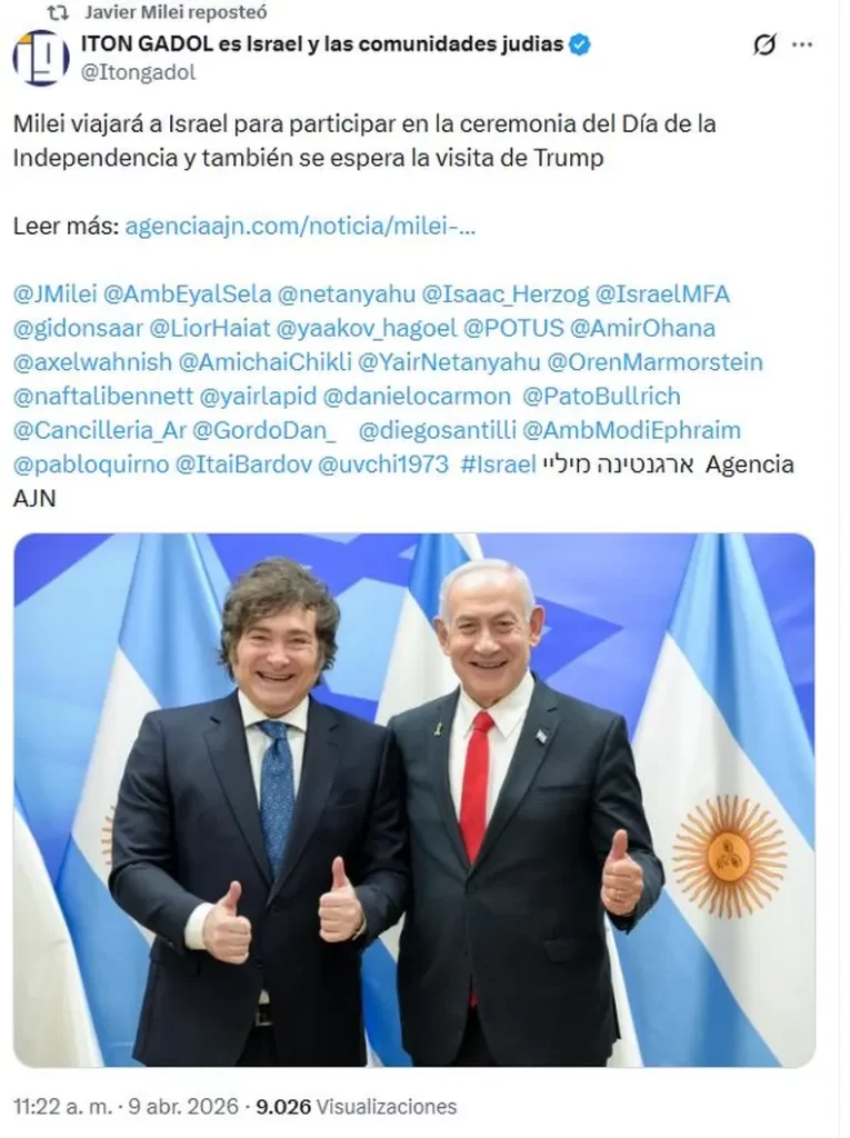 El presidente Javier Milei ratificó este jueves que viajará nuevamente a Israel para participar de las celebraciones por el Día de la Independencia de ese país, previstas entre el 19 y el 22 de abril. La confirmación llegó a través de su cuenta oficial en la red social X, donde el mandatario compartió la información difundida originalmente por la Agencia Judía de Noticias (AJN).