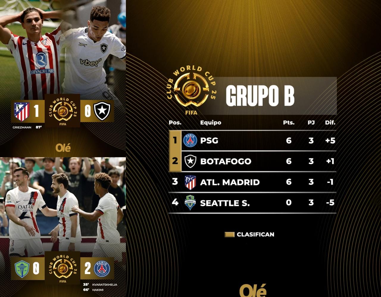 El Paris Saint-Germain, campeón de la Champions League, demostró su poderío ofensivo, obteniendo una diferencia de gol de +5, lo que le permitió asegurar la primera posición del grupo. Por su parte, Botafogo, campeón de la Copa Libertadores, también logró clasificar, aunque con una diferencia de gol de +1.