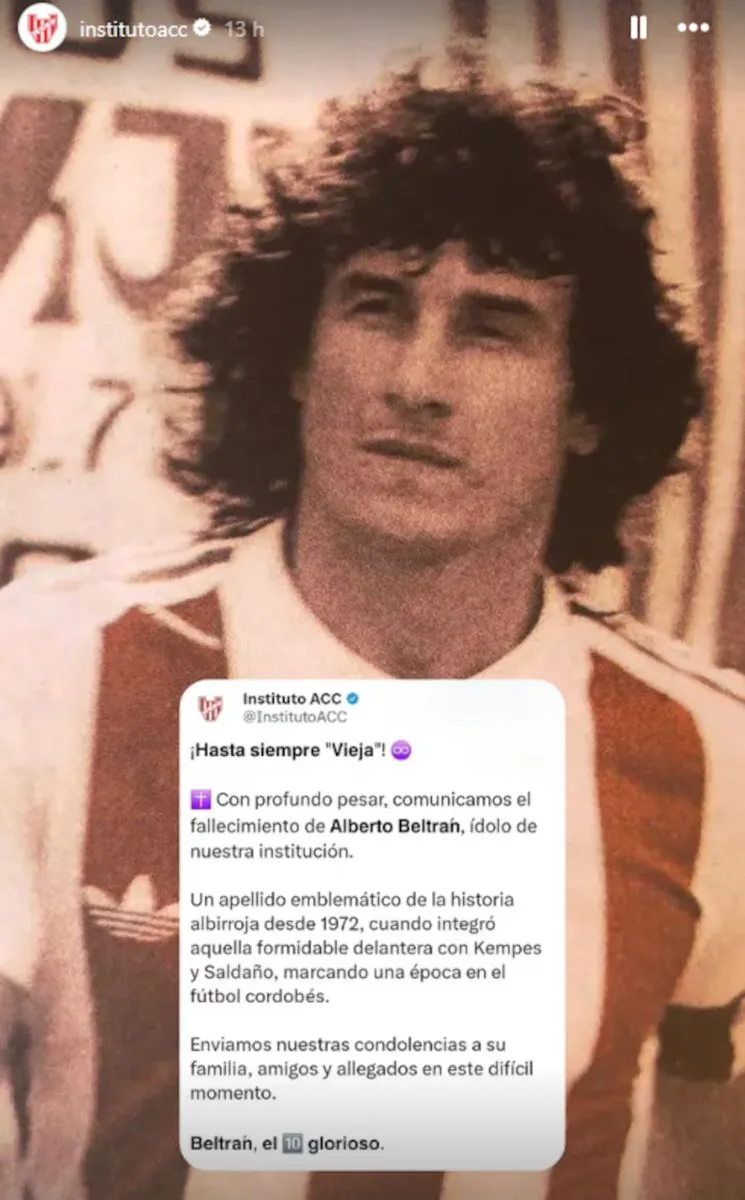 El club Instituto despidió al exfutbolista con un emotivo mensaje en redes sociales: “Un apellido emblemático de la historia albirroja desde 1972… Beltrán, el 10 glorioso”. La publicación generó una gran cantidad de mensajes de afecto y reconocimiento por parte de exjugadores y simpatizantes.