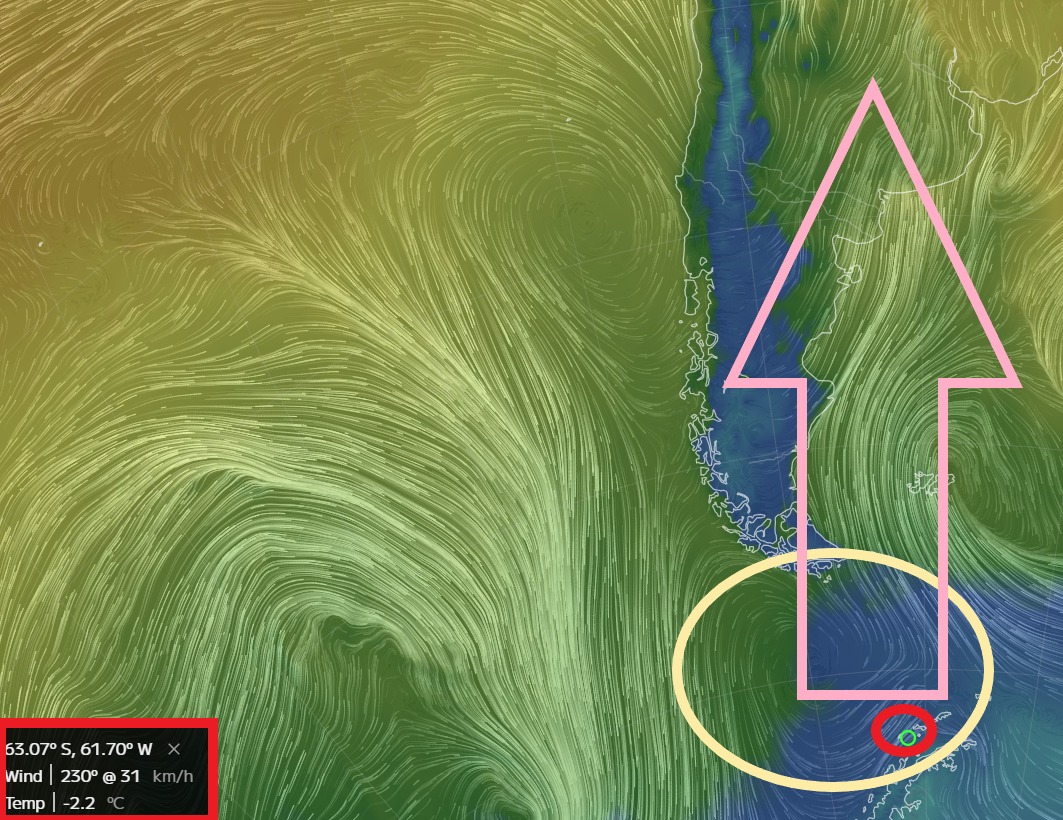 La formación que ha desatado la imaginación se encuentra precisamente en esta región, donde una particular disposición de las líneas de viento, realzada por una flecha rosa que simula un «cuerpo» alargado y un círculo amarillo que envuelve lo que podría ser una «cabeza» con una «cola» marcada por un pequeño círculo rojo, configura la curiosa figura. Si bien este tipo de fenómenos son producto de la interacción de masas de aire, presiones atmosféricas y la geografía del terreno (en este caso, la particular forma de la Península Antártica y las islas circundantes), la mente humana tiende a buscar patrones reconocibles, incluso donde no hay intencionalidad de diseño.